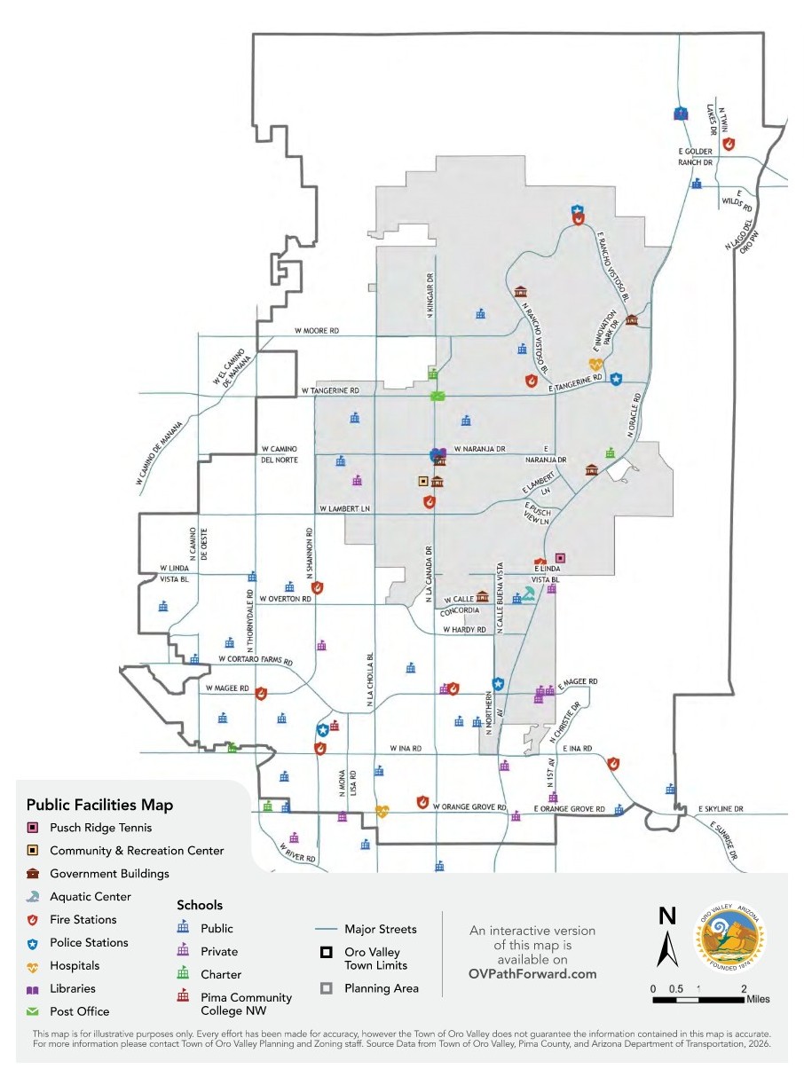 | Land Use Map A map showing the proposed general land uses in Oro Valley. It is the official Oro Valley policy on how land is distributed or set aside for commercial, residential, parks, open space, and other uses. | Public Facilities Map A map of public facilities, such as police and fire stations, schools, government buildings, libraries, and more. | |