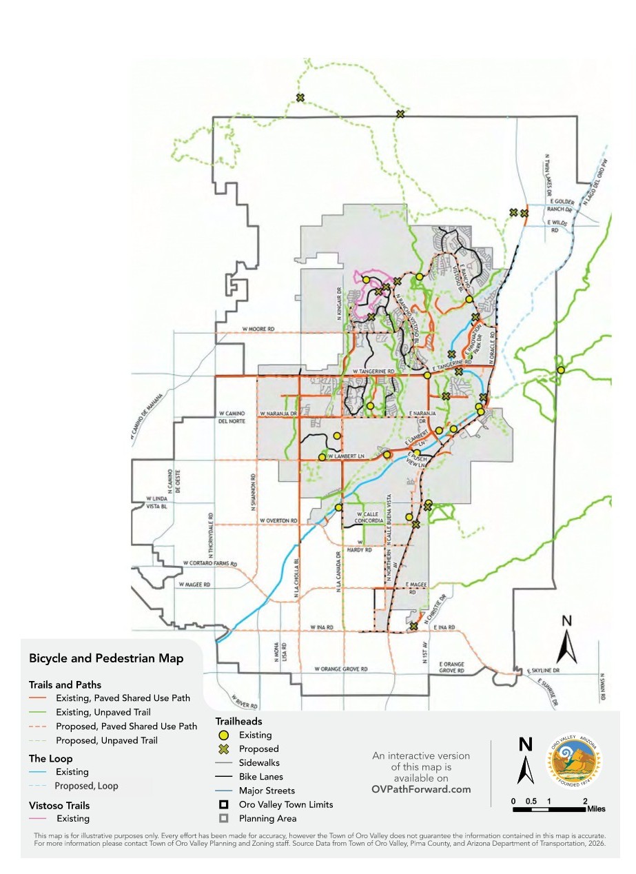 | Parks and Recreation Map A map of Oro Valley’s parks and recreation facilities, including open space systems. | Bicycle and Pedestrian Map A map showing existing and proposed bike and pedestrian routes. | |