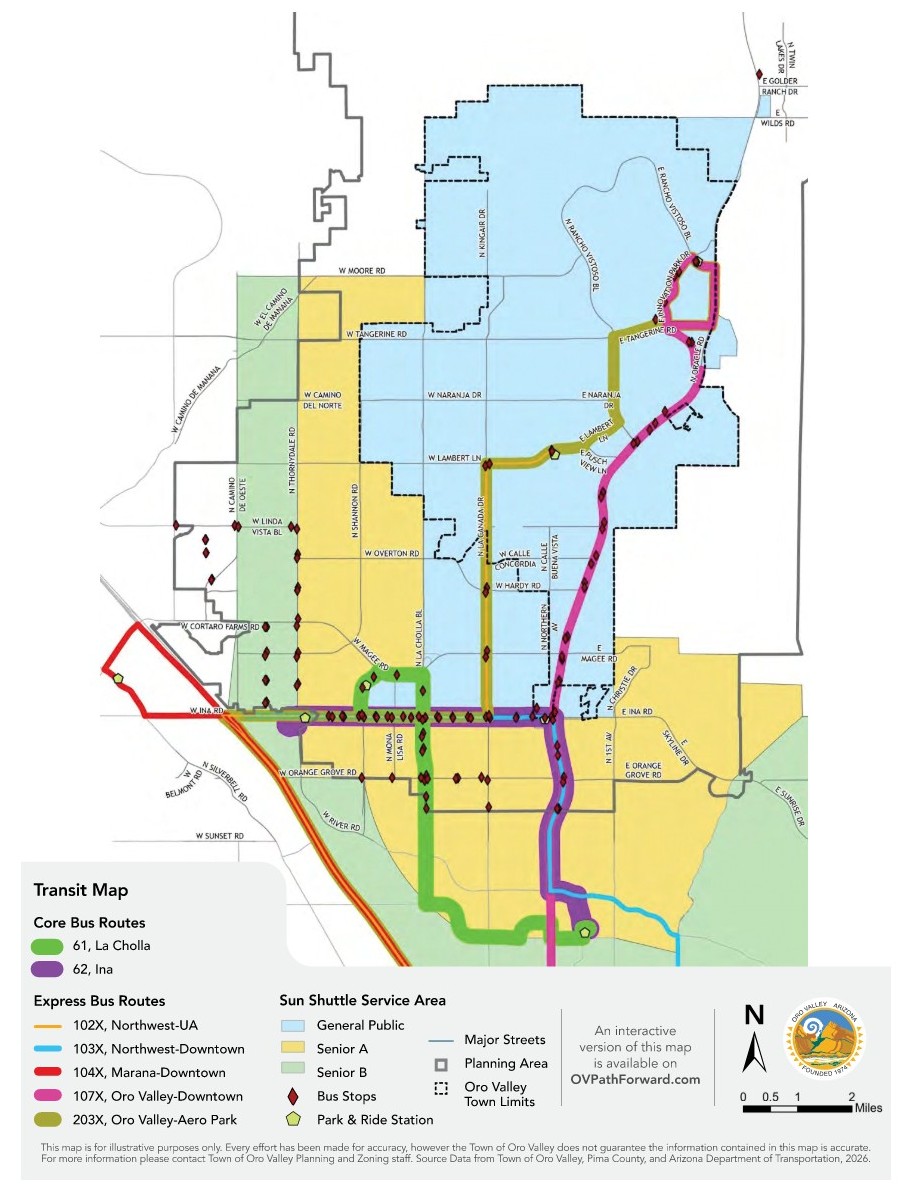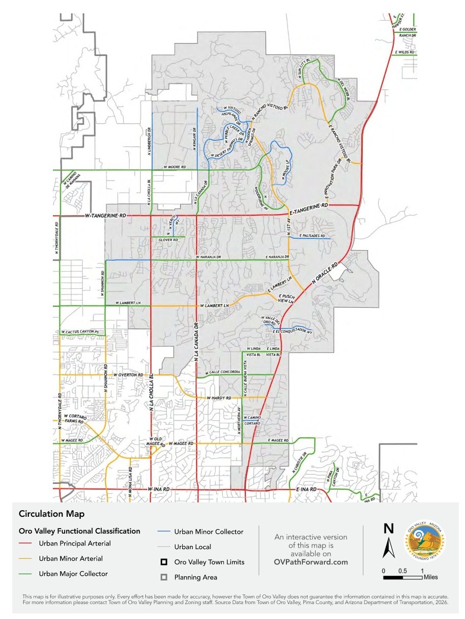 | Circulation Map A map showing the roads, including their classifications, in and around Oro Valley. | A map of transit routes in and around Oro Valley. | |