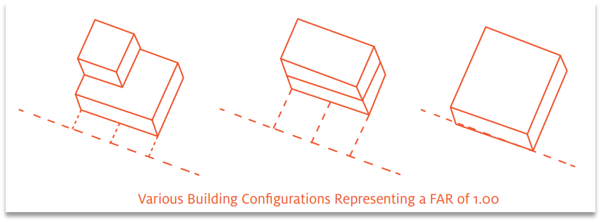 The images below show how buildings of one and two stories could be developed on a given lot with a FAR of 1.00. For example, on a 10,000 square foot lot, a FAR of 1.00 would allow 10,000 square feet of building floor area to be built, regardless of the number of stories.