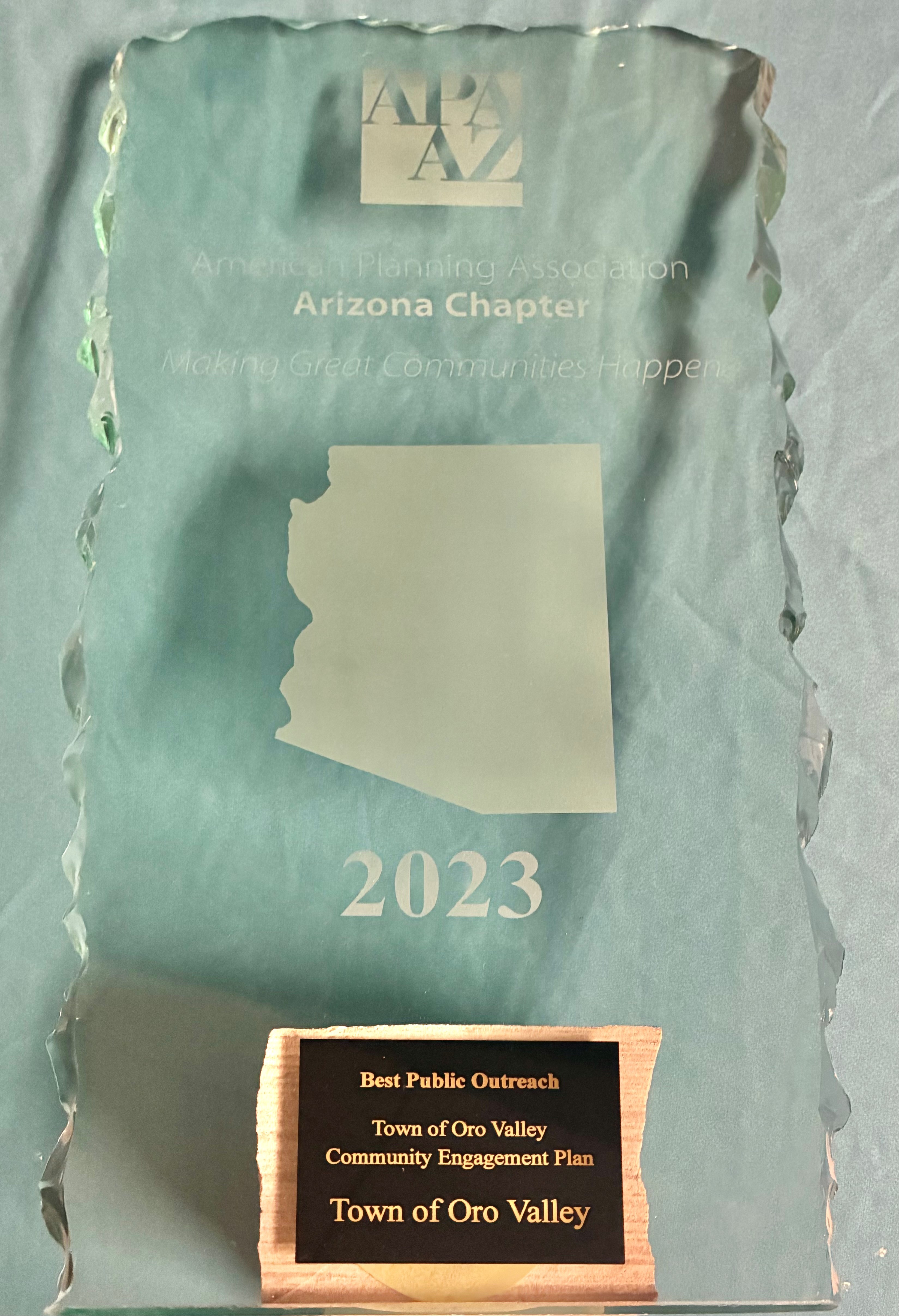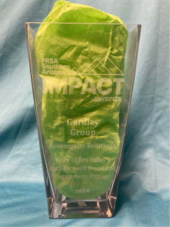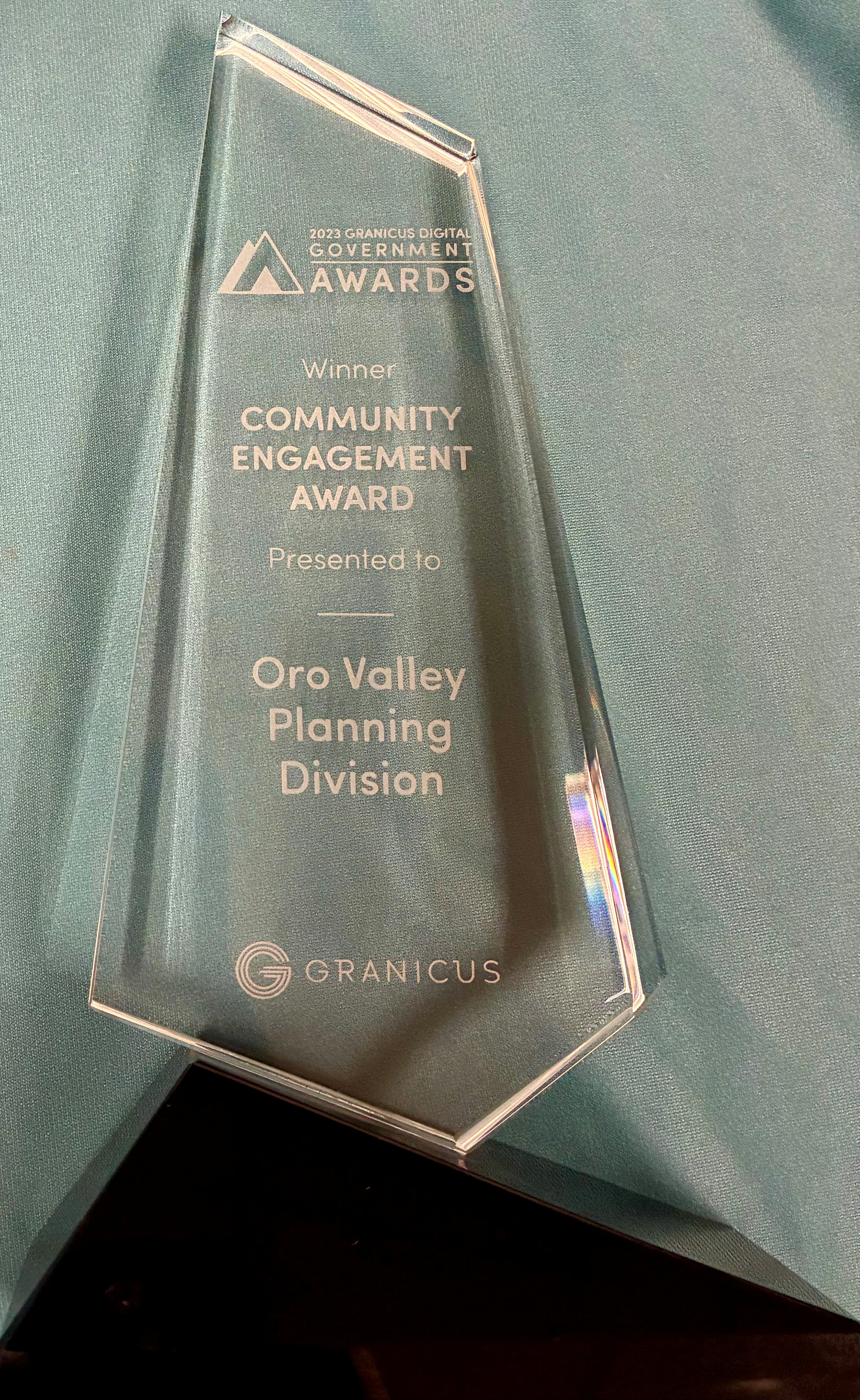 | The resident-driven effort to create the Community Engagement Plan for OV's Path Forward was recognized for Best Public Outreach. It was created by a resident advisory group, who incorporated feedback from a Town-wide survey. It establishes the tools and methods necessary to ensure the process to create OV's Path Forward is transparent, convenient, inclusive, and meaningful. | The substantial number of contributions made on OVPathForward.com during Phase 1: "Let's Talk." won the Granicus Community Engagement Award. Granicus is a global leader in customer experience technologies and services for government entities with over 6,000 public sector customers. This award highlights residents’ commitment to shaping OV’s future. | The Town of Oro Valley, along with Gordley Group, were recognized by the PRSA of Southern Arizona for OV’s Path Forward branding and engagement strategy. A resident advisory group met multiple times to help create the brand, which includes the plan's name, logo, color palette, and more. |
