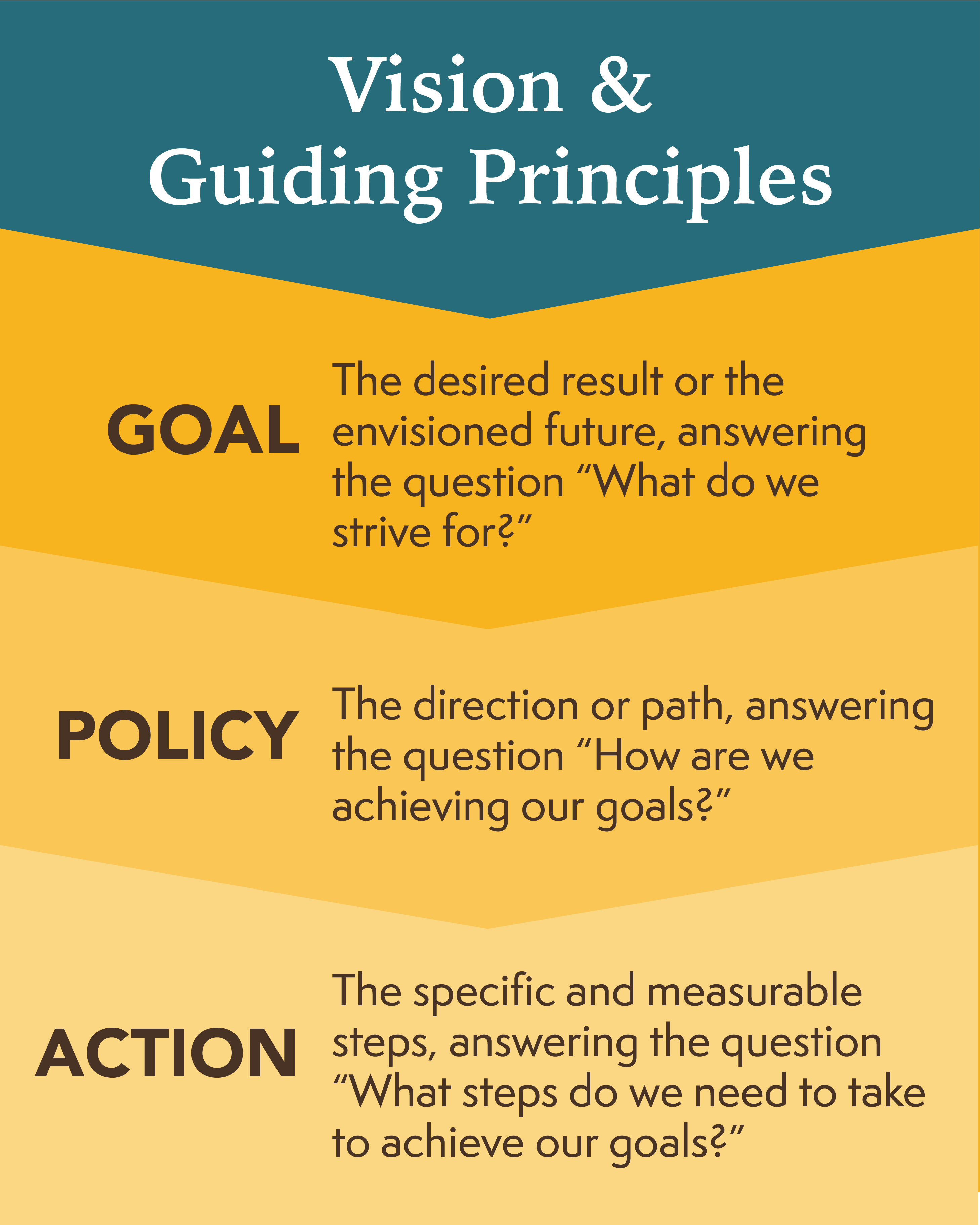 Guiding principles, goals, policies, and specific actions for each topic. The Guiding Principles provide a high-level view building on the vision and establishing the foundation for the goals, policies, and actions. The goals, policies, and actions set the course to turn our vision into a reality.